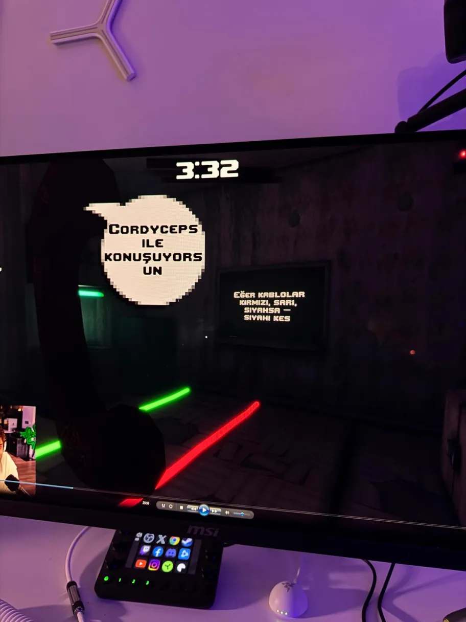 Resimde dikkat çeken en önemli unsur, ekranın ortasında yer alan pikselli konuşma balonlarıdır. 'CORDYCEPS ILE KONUŞUYORSUN' ve kablo kesme talimatı içeren metinler, gerilimli bir atmosfer yaratıyor. Ekranın alt kısmında yeşil ve kırmızı neon ışıkların yansıması, oyuncu ekipmanlarının (stream deck ve mouse) profesyonelliğini vurguluyor. Mor ve morötesi ışıklandırmalı ortam ise derinlik katarak izleyiciye gerçekçi bir oyuncu odası ambiyansı sunuyor.